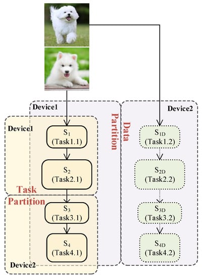 CED (Canny Edge Detection) is an edge detection algorithm that consists of four stages: (1) a Gaussian filter, (2) a Sobel filter, (3) non-maximum suppression, and (4) hysteresis. As shown in Figure 1, lateral data partitioning means the heterogeneous accelerators perform the identical task with different subsets of the data. Vertical task partitioning means each heterogeneous accelerator performs various sub-tasks and communicates between devices. Taking CED processing a stream of video frames as an example, in the case of data partitioning, each heterogeneous accelerator handles a mutually disjoint set of frames. As task partitioning, all frames are serially processed by the first two stages on device1, then by the last two stages on device2.