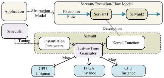 This model specifies that a servant is a minimum unit that can be loaded and unloaded while the system runs. Thus, the servant is the fundamental unit of scheduling in heterogeneous computing.