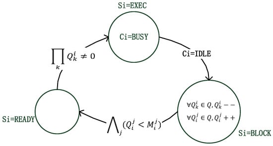 As shown in Figure 3, the first state transition function means the servant will occupy resource and issue execution while meets the following three conditions simultaneously: (1) is under resource idle state; (2) , i.e., any output port has free space; (3) , i.e., all input ports are not empty.