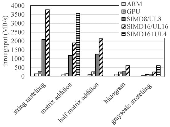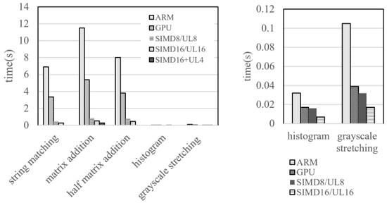 Four commonly used algorithms, S1 string matching, S2 matrix addition, S3 histogram, and S4 contrast stretching, are selected as benchmarks. OpenCV library with OpenMP support [29] is the experimental baseline.