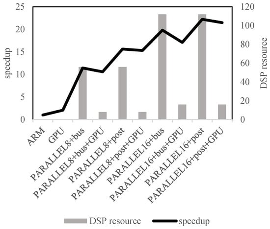 Speedup and DSP resource utilization of FPGA. The subscript numbers under ‘PARALLEL’ represent the parallelism of the FPGA computing units. The ‘bus’ and ‘post’ represent communication mechanisms between servants.
