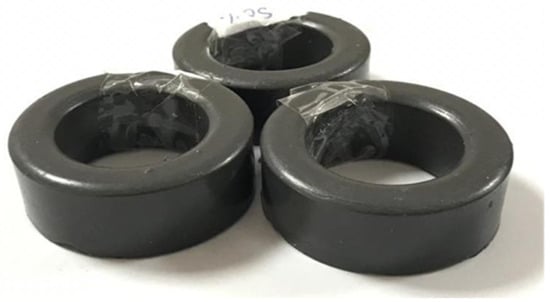The manufacturing process consisted of using silicon molds in the shape of a toroidal core to give the size and shape to the proposed magnetic cores. The cores were manufactured with different percentages of iron powder from 55 to 85%. It was necessary to weigh the iron powder and resin to create the different cores with different percentages of iron powder. After determining the weights corresponding to each material, they were mixed with an organic binder and a catalyst to ensure uniformity, then the mixture was introduced into the silicon molds, followed by cold compaction to help form the toroidal shape. The last step was the machining process of the cores to eliminate imperfections. Figure 4 shows the cores after machining.