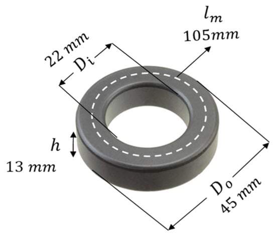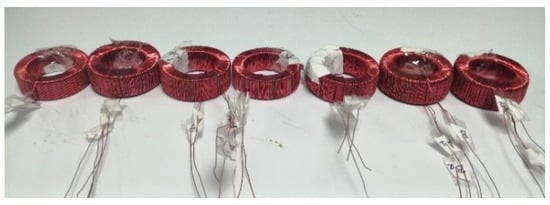 After manufacturing the toroidal cores, it was necessary to determine the relative permeability of each core. For this purpose, the inductive method proposed by the ASTM A772/A772M standard for toroidal-shaped cores was applied [34]. This standard indicates that two windings must be applied to the toroidal core with the same number of turns and then an alternating current must circulate in the primary winding. Figure 5 shows the magnetic cores with the two windings already applied, and Figure 6 graphically illustrates this procedure.