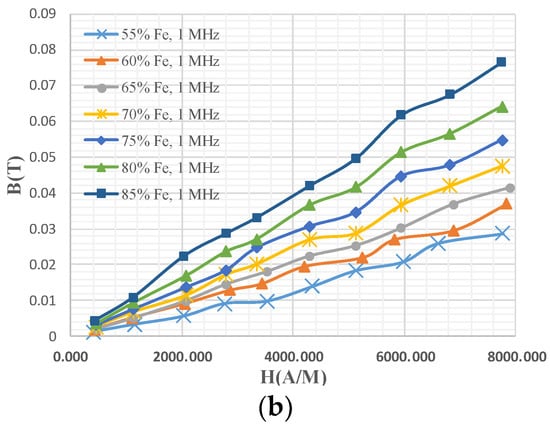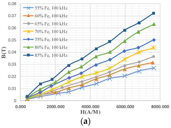 where µo represents the magnetic permeability of the vacuum (4π × 10−7). Figure 9 shows the graph with the obtained values of B and H at the switching frequency of 100 kHz and 1 MHz, and Figure 10 shows the variation in the relative permeability of each core, with different percentages of iron powder in the range of switching frequencies from 100 kHz to 1 MHz. As shown in Figure 9, the resulting plots at the two switching frequencies follow a linear trend, very similar to the hysteresis plot of the air-core inductors, where the relative permeability is equal to 1 and there is no magnetic hysteresis loss due to the absence of hysteresis cycling. In addition, the linear trend shown in the graphs in Figure 9 indicates that the magnetic permeability of the cores does not vary with increasing H or frequency.