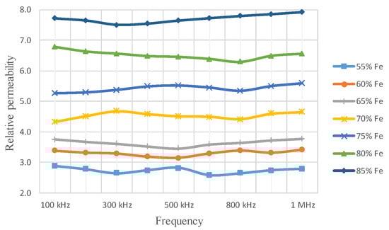 Relative permeability of cores made with different percentages of iron powder in the switching frequency range from 100 kHz to 1 MHz.