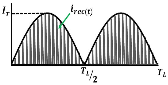 As the applied voltage to the resonant tank is defined by Equation (10), the instantaneous current delivered by the input rectifier “Irec(t)” is defined as