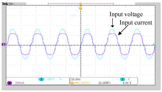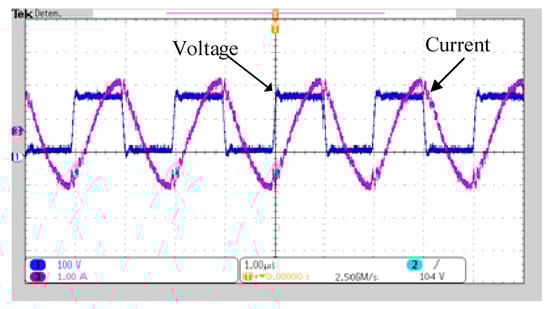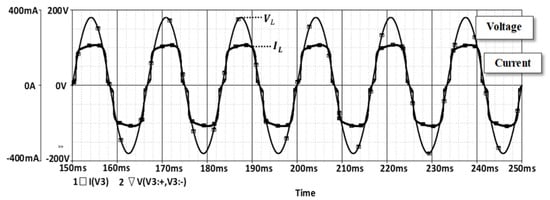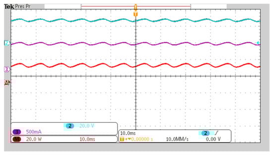 Figure 14 and Figure 15 show the output voltage and current, which present a low-frequency ripple characteristic of single-stage power-factor-correcting circuits [40,41]. Figure 16 shows the output power, which complies with the design parameter given in Table 1. Figure 17 shows the AC source voltage and current at the input of the converter, which shows that the incoming current is very close to a sinusoidal shape and is in phase with the voltage signal. In addition, Figure 17 shows the maximum current value “IL” calculated in Equation (18), which coincides with the values shown in the design methodology in Table 2.