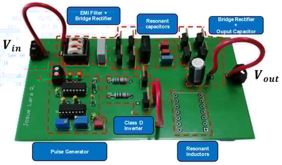 The circuit in Figure 1 was implemented to experimentally validate the design methodology in Table 2 and test the performance of inductors with different magnetic cores in the resonant tank at different switching frequencies from 300 kHz to 800 kHz. Figure 18 shows the resonant converter circuit used to perform the experimental tests. For the experimental tests, current (TCP0020) and differential voltage (THDP0200) probes and a digital oscilloscope (DPO2014B) from TEKTRONIX were used.