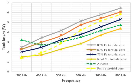 Figure 22 shows in blocks the locations where these measurements were performed in the converter. The toroidal cores used were those created with the composite material with iron powder percentages of 85%, 80%, and 75%. Since we wanted to compare the performance of these cores, they were compared with the following cores: a toroidal powder core Kool Mµ from Magnetics (Hong Kong), NiZn ferrite toroidal core from Fair-Rite, and toroidal air core, where the toroidal air core was manufactured with a mixture of organic binder and catalyst without iron powder. The dimensions of the cores correspond to those shown in Figure 7. Figure 23 shows the power losses in the resonant tank with each core operating in a switching frequency range from 300 kHz to 800 kHz with an output power of 19 watts, as established in Table 1. Figure 24 shows the variation in the converter efficiency.