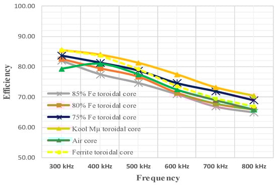 Efficiency in the resonant converter with inductors using different magnetic cores.