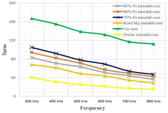 As shown in Figure 23 and Figure 24, the magnetic core with the highest losses and lowest efficiency was the 85% iron powder core, and the core with the lowest losses and highest efficiency was the Kool Mu core from magnetics. It is interesting to see that using the core with 75% iron powder resulted in better circuit efficiency than when using the air core and also better efficiency than when using the ferrite core with a switching frequency of 600 kHz to 800 kHz. These results show that a higher percentage of iron powder in the composite material results in higher core losses, whereas in the air-core inductor, despite having no core losses, the losses increase due to stray inductances that change the required inductance, generating higher losses during switching, as well as wiring losses and parasitic capacitances that increase with the number of turns and the switching frequency. Figure 25 shows the number of turns for the required inductance at each switching frequency, where the air core needed the highest number of turns.