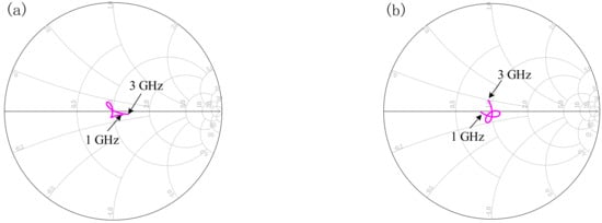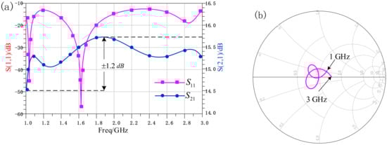 Figure 8a shows the impedance track of the output matching network in the range of 1~3 GHz, and Figure 8b shows the impedance track of the input matching network in the range of 1~3 GHz. From these figures, it can be seen that the impedance points of the two matching networks in the range of 1 to 3 GHz are around 50 Ω and maintain a small distance from the 50 Ω point. Compared with the impedance values shown in Table 1, the results verify that the matching network has an excellent ability to transform the varying impedance in a large range. If there is a need for wider bandwidth, it only need to calculate the value of each LC-loop according to the upper and lower frequency limits, so the matching network structure proposed in this paper has stronger scalability and wider applicability than other studies.