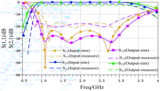 Then, from the S-parameter simulation results in Figure 9, it can be seen that the two matching networks not only have outstanding matching characteristics in the operating band, but also can produce out-of-band rejection very quickly, which will have a perfect effect on the harmonic suppression.