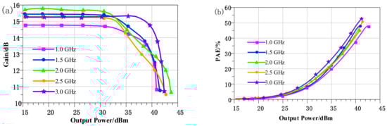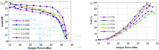 From the HB-balance simulation results in Figure 13a, it can be seen that the gain is in the range of 14.7~15.8 dB and the gain flatness is less than ±1.1 dB. The saturation output power of the proposed PA is greater than 40 dBm. According to Figure 13b, the power added efficiency (PAE) is greater than 45% in the entire operating band. In summary, the proposed PA has excellent broadband characteristics and typical class AB characteristics, with high output capability and good gain flatness.