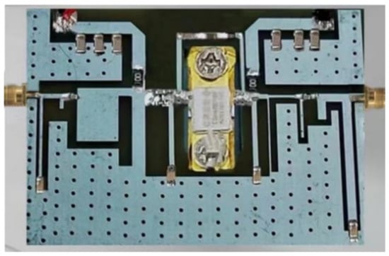The design was manufactured on a FR4 substrate, and the dielectric constant is 4.5. Meanwhile, the plate thickness is 0.8 mm, and the transistor used in the PA is Cree’s CGH40010F GaN transistors. The drain bias voltage is 28 V, and the gate bias voltage is −2.5 V, leading to the PA was biased in class AB. Since the gain of transistors has the characteristic of frequency roll-off, the difference of gain between high and low frequencies is large. Therefore, as shown in Figure 6, a negative feedback network is built between the gate and the drain, so that the PA obtains a flat gain over the entire band. The negative feedback network consists of resistors, capacitors and inductors.