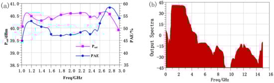 The measured results of frequency domain performance. (a) Psat & PAE performance; (b) Output spectra.
