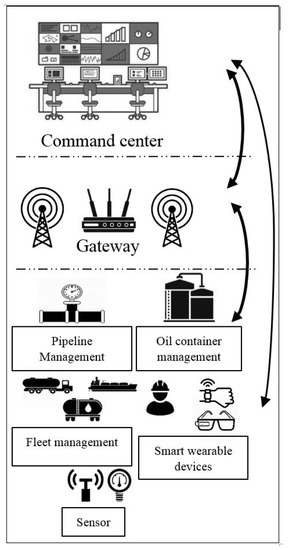 Figure 1 illustrates the IoT-based oil production industry network. The lower section is where the smart oilfields are deployed and performed. In smart oilfields, smart devices and equipment with many sensors are deployed to sense and gather hybrid data (i.e., images, videos, ambient data, etc.) from various locations in various formats. The intelligent equipment can also respond to complex circumstances, such as high/low temperature/pressure of manifolds, separation vases, surge tanks, oil pumps, etc. In pipeline management, sensors monitor temperature, flow, pressure, and leakages and send notifications to engineers and the command center. The oil/gas containers measure the load and status of safely unloading oil/gas. Fleet management monitors and inspects the fleet from the field to the oil/gas stations. Predictive analysis determines maintenance, and the automated supply chain orders repair pieces based on observable data [35]. In the oilfields, engineers receive warnings and event information on their smart devices, such as phones, tablets or smart wearables, e.g., smartwatches and smart eyeglasses, and prepare to respond. As shown with arrows, each smart device includes a transceiver to communicate with other devices and send the gathered data directly to the command center via long-range communication (if available) or through gateways via short-range communications. The middle section of the network is the gateway. The gateway combines networking protocols and allows the safe data flow between smart devices and the cloud and/or command center. The highest section is the command center. It is in charge of application and data processing from the smart devices, equipment and sensors, generating input to make critical decisions in anomalous situations and has a dashboard to support the decision-making process.