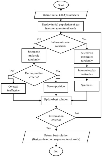 As illustrated in Figure 2, the proposed approach starts with defining initial variables. Then, it repeats by applying one of the four elementary reaction phases until the termination criteria are met and returns the best optimal solution at the end. Figure 3 represents the pseudo-code of the proposed multi-objective chemical reaction optimization to solve the gas lift allocation problem.