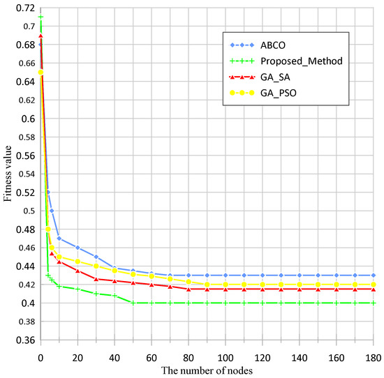 The proposed algorithm for determining the fitness function is shown in Figure 4. In this experiment, the number of generations (0–250) was performed at a speed of 2000 million instructions per second, whose fitness function was in the range between (1–0). To test the convergence, the proposed algorithm is compared to the ABCO [32], GA_PSO [31] and GA_SA [34] in 180 repetitions. As the number of generations increases, the fitness function reaches a constant value. Figure 4 presents the convergence of the proposed method and the other techniques to compare the best answers. The suggested technique converges in a smaller number of iterations; it means that the convergence speed of the suggested technique is more acceptable than the convergence speed of other algorithms. In the proposed method, when the current optimal solution does not show any improvement in the value of the fitness function in continuous iterations, the algorithm assumes that the necessary convergence is achieved and the execution of the program ends.