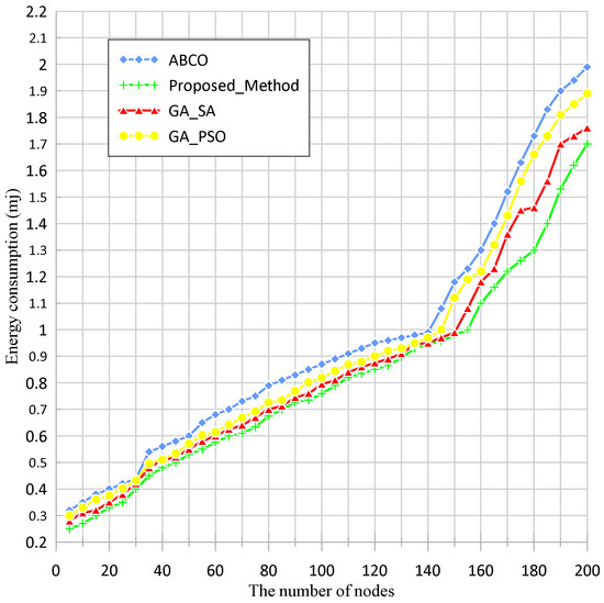 Many studies have paid special attention to energy consumption. The results of the proposed method for reducing energy consumption compared to other methods are shown in Figure 6. According to the figure, it can be seen that the proposed algorithm has been able to reduce energy consumption. Figure 6 depicts energy consumption based on the total number of nodes. As the number of nodes increase, so does the amount of energy consumed. The proposed method improves energy consumption and outperforms the GA_SA, ABCO and GA_PSO.