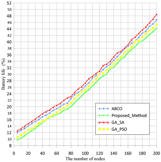 where denotes the battery life of the IoT node and defines as energy/joules, is the time, denotes the current drawn and denotes the voltage required by the IoT node. According to the figure, it can be seen that the proposed algorithm was able to increase the battery life. In addition, the proposed method outperforms the ABCO and GA_SA and GA_PSO methods.