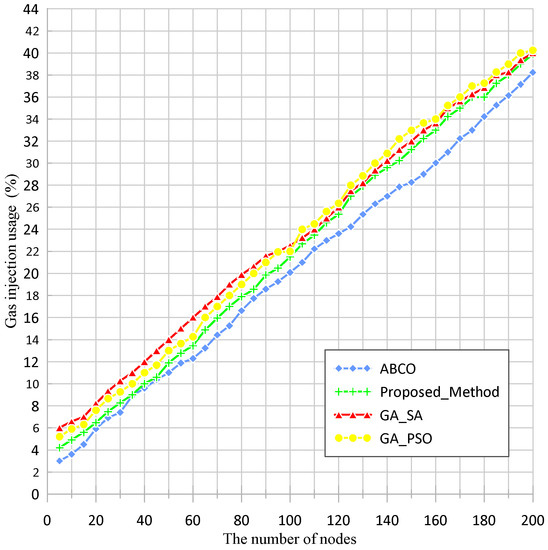The results of the simulation for reducing gas injection usage are shown in Figure 8. The proposed algorithm is compared to the evolutionary GA_PSO, ABCO and GA_SA. As can be seen in the figure, the ABCO outperforms the proposed method. However, according to the figure, it can be seen that the proposed algorithm was able to reduce gas injection compared to the other two methods.