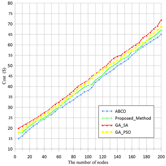The results of the simulation to reduce the cost are shown in Figure 9. The proposed algorithm is compared to the evolutionary GA_PSO, ABCO and GA_SA. The cost of all methods compared in this study increases significantly with an increasing number of nodes. According to the figure, the proposed algorithm reduced the costs compared to the other two algorithms. However, the ABCO algorithm reduced costs slightly better than the proposed method.