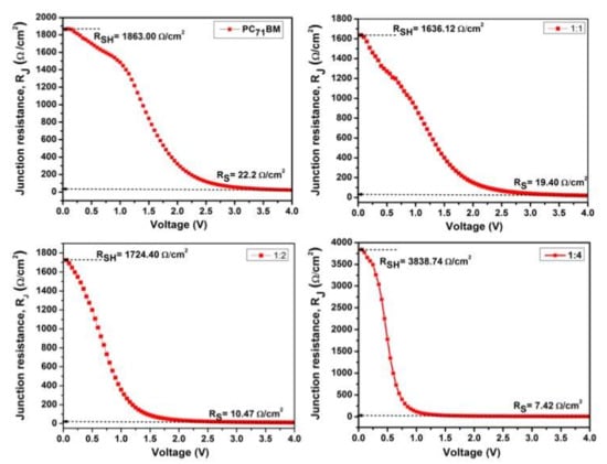 | Resistance (Ω/cm2) | VTP | PC71BM | 1:1 | 1:2 | 1:4 |