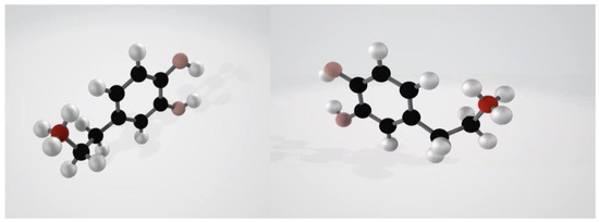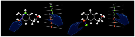 Two-dimensional models of complex chemical structures have existed for decades and translating them into an interactive 3D modality is a relatively new area of research where immersive technologies demonstrate particular value. In fact, the only molecular visualization program that has been translated into a virtual format is Chimera, while others have been adapted into AR and VR-based solutions [33,34], and the applications such as VRmol [35], our moleculARweb [36], and ProteinVR [37] are Web Browser-based. This opens the field for the development of various applications supporting chemistry education. Ref. [38] proposed AR tools to study the material structures and chemical equilibrium at the high school level, where students can use tools to conduct virtual chemical experiments. Here, a user proposes a chemical equation that includes reagents and coefficients on AR cards. The results are displayed as a submicroscopic image of the chemical reaction. When compared against groups taught traditionally, the proposed AR method resulted in better learning outcomes, particularly among students with lower baseline academic performance. Ref. [39] presented a mobile application, MolAR, that allows users to visualize molecules in AR directly from hand-drawn chemical structures. Another application is AR Chemistry Learning, which allows users to interact with virtual images that represent different molecules, where particular elements are marked in different colors [40]. This tool combines AR with Machine Learning to transform hand-painted structures into 3D images, with applications beyond education in visualizing protein structures and analyzing molecular properties by specialists. Thus, AR-based applications are a helpful teaching resource for understanding complex chemical principles [41].
