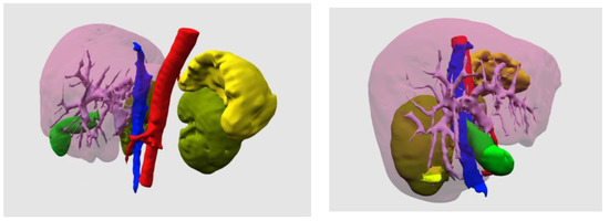Our system can be also applied to medical education, in particular anatomy. For example, a 3D model of a liver tumor was prepared from CT images. The liver tumor was removed using a surgical robot. Precise diagnostics are crucial to clearly define the surgical extent and feasibility of resection. To enable this, segmentation of the CT data was performed to highlight relevant structures. Then users display the resulting model as interactive holograms using the HoloLens 2 that can be rotated, move, and scaled with gesture or voice control. Preoperative imaging to produce holograms very precisely shows all the anatomical structures of the organs, see Figure 6. Thus, the 3D enables better visualization of the tumor’s location and improves the understanding of the spatial relation between anatomical structures. Thus, this solution is effective in enabling both students and junior surgeons to understand local anatomy in any given case. Moreover, this can be also used to simulate planned operations from different approaches and using various techniques. Consequently, the learning curve for surgeons may be expedited and the operating room workflow may be streamlined.
