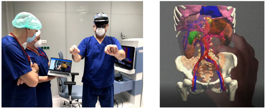 Immersive technologies are also valuable in clinical practice. Ref. [51] described how remote guidance from an experienced surgeon using Google Glass AR technology helped not only interns but also seasoned surgeons learn new surgical procedures such as arthroscopy or shoulder arthroplasty. This solution links imaging data with what the surgeon sees live, allowing them to proceed with the operation without taking their eyes off the patient. Ref. [52] described a VR surgical mentor, where expert knowledge was combined with virtual surgical tools and illustrative animations to lead to more confident decision making. We can also use MR technologies to optimize preprocedural planning and intraprocedural monitoring in advanced imaging in interventional cardiology [53]. In [54], the combination of ultrasound with Augmented Reality has been shown in the field of rabbit liver therapy.