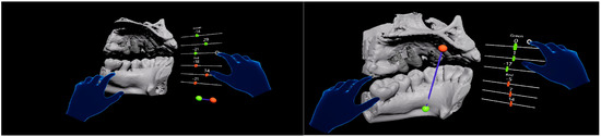In Figure 7, we proposed an application to learn how to plan the removal of impacted teeth. The 3D model of the jaw based off an MRI image is displayed for the user. The points mark the place where the tooth is grasped (red) and the direction of pulling force (green). The application allows users to set coordinates for the grasp and pull points using sliders.