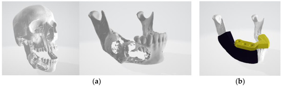 This approach can also be applied in maxillary surgery education, specifically treating mandible tumors (Figure 8). The subject was hospitalized due to a right-sided tumor at the angle of the jaw. Sections taken under general anesthesia were ultimately determined histopathologically to be: ameloblastoma, follicular type. The patient was in a good general condition without any obvious disease burden. Due to their young age, histopathology, and the lack of disease burden, the decision was made to perform a microsurgical resection of the mandible from the mandibular branch to tooth 42 and reconstruct the resulting defect using a right iliac crest allograft. 3D models of the jaw in Figure 8a show bone loss caused by the tumor, while Figure 8b shows a 3D model of the jaw with implants.