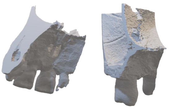 Resorption is a process involving the loss of hard tissues (dentin, root cementum, enamel) as a result of various factors. The model is made on the basis of the micro-CT of tooth 23, see Figure 9. Here, the bulbous widening of the tooth chamber is visible in the cross-sections. This model can be displayed in HoloLens 2. The point perforation of the mesial wall of tooth 23 can be observed after rotating the model.