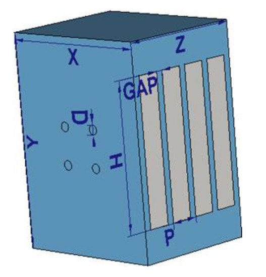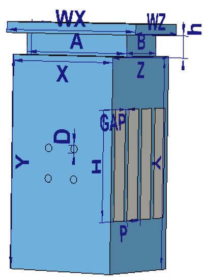 Ladder-shaped resonant cavities have been considered for larger shunt impedances (with extended interaction configuration), and multiple numbers of beams have been considered for low operating voltage (and individual beamlet current) and microfabrication and 3D fabrication compatibility. Initial cavity dimensions (height and width) have been determined using the conventional analytical formula [11,25,27,35,36,37,38].