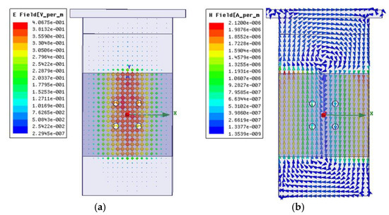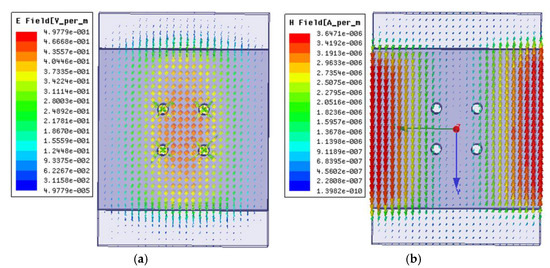 Figure 5a shows the electric field distribution of the cavity, and Figure 5b shows the magnetic field distribution of the proposed cavity. The frequency of the mode is found to be 28.52 GHz, and the quality factor is also found to be 708 from the HFSS simulations. The final optimized geometrical design parameters of the intermediate cavity for the Ka-band are given in Table 2, and the simulated results are shown in Table 3.