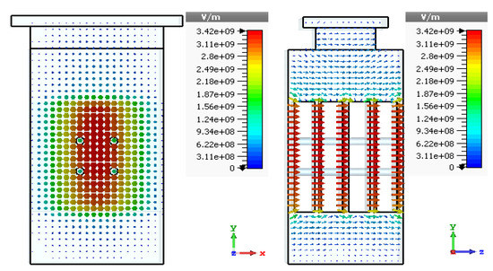 Figure 7 shows the cutting plane view of the electric field distribution of the proposed input and output cavities while Figure 8 shows a cutting plane view of the magnetic field pattern of the proposed input and output cavities. The mode frequency is found to be 28.53 GHz from the CST simulations, considering the gap and drift tube radius to be the same as those of the intermediate cavities. The quality factor of the cavities has been obtained as 720, and the calculated shunt impedance of the operating mode across the gaps is 31.85 MΩ. According to the CST calculations, the R over Q is estimated to be 44.2.