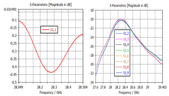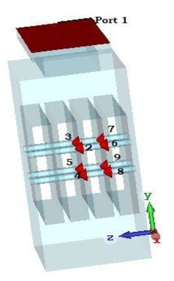 Figure 10 shows the geometry used for the time-domain simulation of the input and output cavities. In this step, a rectangular port (port 1) on the output waveguide coupler and a set of discrete ports (port 2 to 9) at the gap centers of different beamlets have been considered, as shown in Figure 10. The time-domain simulation has been carried out using a CST studio time-domain solver, and the obtained reflection and transmission coefficients are shown in Figure 11. The almost identical transmission parameters in Figure 11 clearly show a symmetric field distribution among the four beamlets’ gaps. The reflection parameter dip suggests a significant coupling of the electromagnetic energy through the coupling slot at the operating frequency.