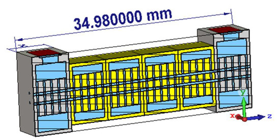 This section discusses the simulation results of the ladder-shaped multibeam extended interaction resonant cavities (with four drift tubes) and the RF section using commercial electromagnetic simulators [39,40]. The initial geometrical design parameters, such as the dimensions of the cavity, gap lengths, drift tube parameters, and intercavity distances, are obtained from the analytical approach presented in the previous section. The cavity geometry and the RF section are then modeled and simulated in the three-dimensional electromagnetic simulation tools. The electromagnetic simulations regarding the device performance have been validated via the overall agreement between two well-established commercial software using two different computational methods for electromagnetic simulations. The CST studio tool uses the hexahedral volumetric meshing scheme together with a finite integration technique (similar to the finite difference technique) while the HFSS employs a triangular surface meshing with a finite element method for the simulations. The agreement between the simulation results obtained using these two simulation tools employing different numerical techniques represents the accuracy of the simulation. The small variation in the results can be attributed to the different meshing schemes employed in the two simulation tools. In the different meshing schemes, the dimensions (the area and volume) of the unit mesh cells are approximated differently. Therefore, the calculated resonant frequencies, electromagnetic fields inside the cells, and RF losses come out to be slightly different. Consequently, the quality factor (which depends upon the resonant frequency and RF losses) and the R over Q (which depends upon the developed electric field across the accelerating gaps and quality factor) also become slightly different.