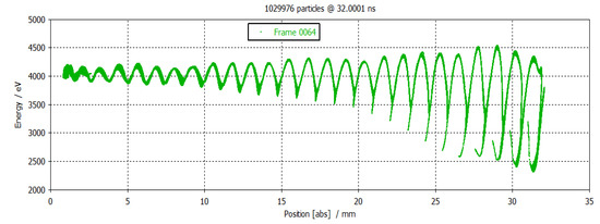 Figure 12 shows the cut-plane view of the RF section of the proposed four-beams EIK. The simulation geometry has been modeled and simulated using the CST PIC simulation tool. In this structure, six cavities (including the input and output cavities) have been considered. In this model, the center-to-center distance between the cavities has been taken as 5.83 mm and the length of the beam tunnel has been taken as 34.98 mm. The input signal used is a single-frequency sinusoidal signal with a constant amplitude. An axial magnetic field of 0.33 T (calculated according to Equation (15)) has been applied to maintain the focusing of the electron beam throughout the RF section. The frequency of the input signal has been swept in the complete frequency band of operation (i.e., 27.95 GHz to 28.95 GHz) to obtain the steady-state gain of the device. It may be noted that for each frequency point, the PIC simulation takes about 40 h to attain the steady state. A snapshot of the beam trajectory representing the bunching of the electrons at the output cavity and the phase space plot at 32 ns are shown in Figure 13 and Figure 14. The details of the input signal for one particular frequency point are shown in Figure 15 and Figure 16.