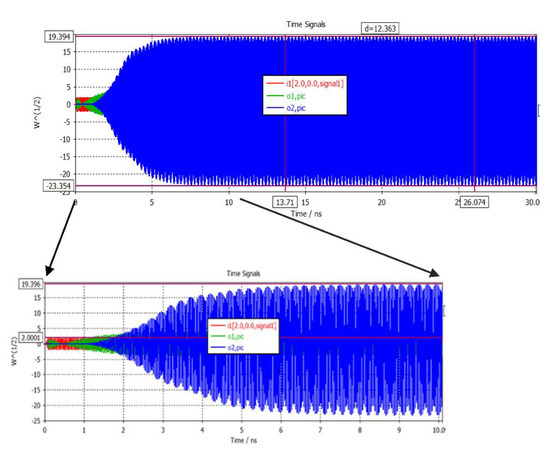 Figure 15 shows the input RF signal. This signal has been applied at the input port of the RF section. Figure 14 shows the output signal from the RF section. The output signal has been recorded at the output waveguide port after the beam–wave interactions in the RF section. From Figure 14, it can be observed that the maximum amplitude of the output signal is 19.39 √(watt), corresponding to an input signal of 2.0 √(watt) (peak). The peak output power calculated from the output signal is more than 375.97 W and the RMS output power is 187.98 W. The frequency spectrum of the output signal is shown in Figure 17. Figure 17 clearly shows the peak of the spectrum at 28.5 GHz.