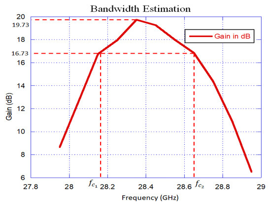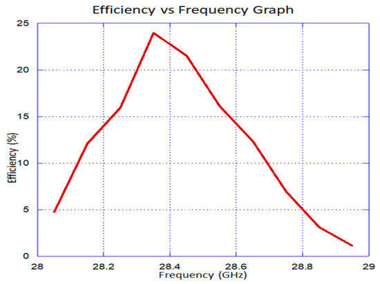 The gain of the RF section for different frequencies has been plotted in Figure 18, and the efficiency of the device in different frequencies is plotted in Figure 19. From this plot, the higher (fh) and lower (fl) −3 dB frequency points are found to be fh = 28.66 GHz and fl = 28.15 GHz. Therefore, the −3 dB bandwidth of the device can be calculated as 510 MHz. Similarly, the −1 dB bandwidth of the device comes out to be 180 MHz. The operating bandwidth of the device can be further increased by employing the stagger tuning of the intermediate cavities, i.e., tuning each individual cavity at slightly different frequencies.