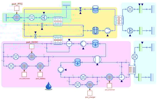 Example simulation of an automotive battery, drive-chain and cabin thermal control system. The glycol-water loop (magenta) is cooling battery, DC–DC converter, charger, and drive-chain. A four-way switch can split it into two separate loops instead of the combined loop that is shown. If needed, the loop is cooled by a radiator against fresh air (blue). Additionally it can be cooled with a R134a vapor-cycle (orange). The vapor-cycle is also cooling air going to the vehicle cabin (green) and, therefore, contains two parallel evaporators, that can independently be shut off by two valves when not in use. It is cooled against fresh air with a condenser. Furthermore, it contains receiver, accumulator, and an expansion valve. Battery and cabin-air can be heated with the battery heater and PTC, respectively. Both heat exchangers of the glycol loop can be bypassed if not in use. One of the fresh-air streams and the cabin-air stream is supported by a fan, while the other fresh-air stream is driven purely by dynamic pressure from the vehicle speed. See Figure 2 for a detailed shape explanation.
