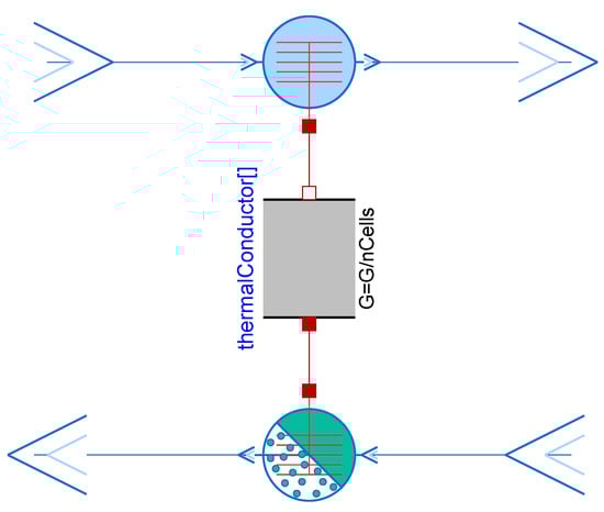 The discretized heat exchanger consists of N heat conducting elements on each side of the fluid. They are connected via a thermal conductor from the MSL. The number of discretization elements can be set by the modeler. Figure 3 shows how the single elements are connected to each other. The fluid ports are arranged in terms of a counter-flow heat exchanger.