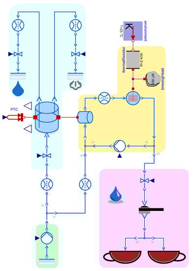 Example of a model with individualized component models. This model simulates an espresso machine composed of water source and pump (green); boiler, water, and steam outlets (blue); brewing head with cycling water (yellow); and valve, coffee strainer, and cups (magenta). Cold water enters the machine through a source at atmospheric pressure and becomes pressurized by a pump to 8.5 bar. Part of the water goes through a control valve into a boiler, where the pressure is regulated by heating through a PTC and the water level is controlled by the valve. For this purpose, the boiler outputs both of these quantities. From the boiler, steam or boiling water can exit if the corresponding valve is opened. The boiler is in thermal contact to a secondary small volume from which water cycles to the brewing head and back, heating up the brewing head. If the machine is at temperature, the valve in front of the coffee strainer is opened and water flows from the pump into the cups, picking up heat in the secondary volume and the brewing head.