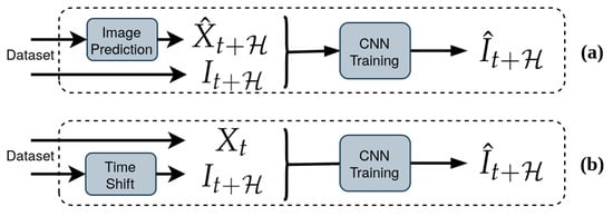 The problem of image regression for irradiance estimation can be formulated as follows. Considering a dataset that consists of a paired sky image and corresponding irradiance measurement at time t, an image regression CNN model can be trained to produce a single value that represents an estimation of the irradiance when provided with the sky image . With the above formulation, the image regression for irradiance estimation can be expanded to image regression for irradiance forecasting in two ways. First, assuming an external module that can predict the future sky image after time in a sequence [,,], the image regression CNN model can then produce the corresponding estimation of the irradiance from this image. Alternatively, an image regression CNN model can be trained on sequences of images where the corresponding irradiance values have been shifted backwards in time by . In this way, when the model is provided with a sky image at time t it produces the irradiance forecast . The above image regression for the irradiance forecasting problem formulation is illustrated in Figure 1.