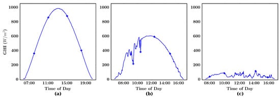 Daily GHI plots for the days (a) 7 June 2014, (b) 3 November 2014, and (c) 24 December 2014.