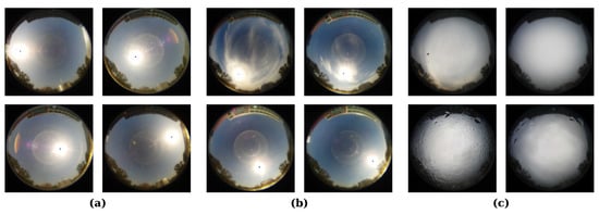 Image processing techniques towards irradiance forecasting can be applied on satellite imagery [,,]. However, images obtained from fisheye lens ( field of view) SIs local to the PV parks can provide increased spatial and temporal resolution. This fact can favor the precise irradiance forecasting for specific areas, such as PV parks, and for very short-term forecast horizons of up to 15 min.