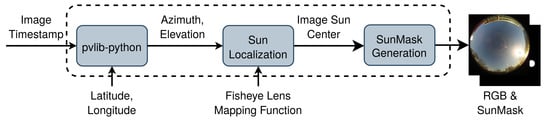 The first step in our method is to calculate the center of the sun disk in the image. Approaches that are based on the RGB values of the image often fail to identify the position of the sun when it is hidden by clouds. Furthermore, high-intensity background objects and glare effects can be erroneously identified as the sun. Due to the above, we opt for an approach based on the solar azimuth and zenith angles, and . The summary of our approach to sun localization is illustrated in Figure 6. Considering the timestamp of an image along with the latitude and longitude coordinates, we calculate and using pvlib-python []. Because of the fisheye distortion of the lens of the camera, simply projecting the solar coordinates on a flat surface does not result in accurate identification of the sun’s center in the image. To address this, we use the mapping function of the lens to calculate the distance of the sun from the center of the image R as a function of the focal length of the lens f and the angle from the optical axis . The mapping functions vary based on the type of projection (stereographic, equidistant, etc.) of the lens, and neither this information nor the focal length is available for the camera used to create the Folsom, CA dataset. Through trial and error, we were able to identify that the stereographic projection with a focal length of provides the most accurate results. Thus, we use the mapping function of the stereographic projection