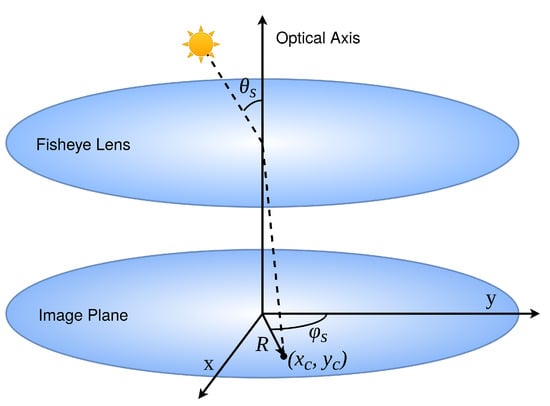 where we replace with the solar zenith angle . After calculating the distance of the sun from the center of the image, we calculate the Cartesian coordinates using the solar azimuth angle with